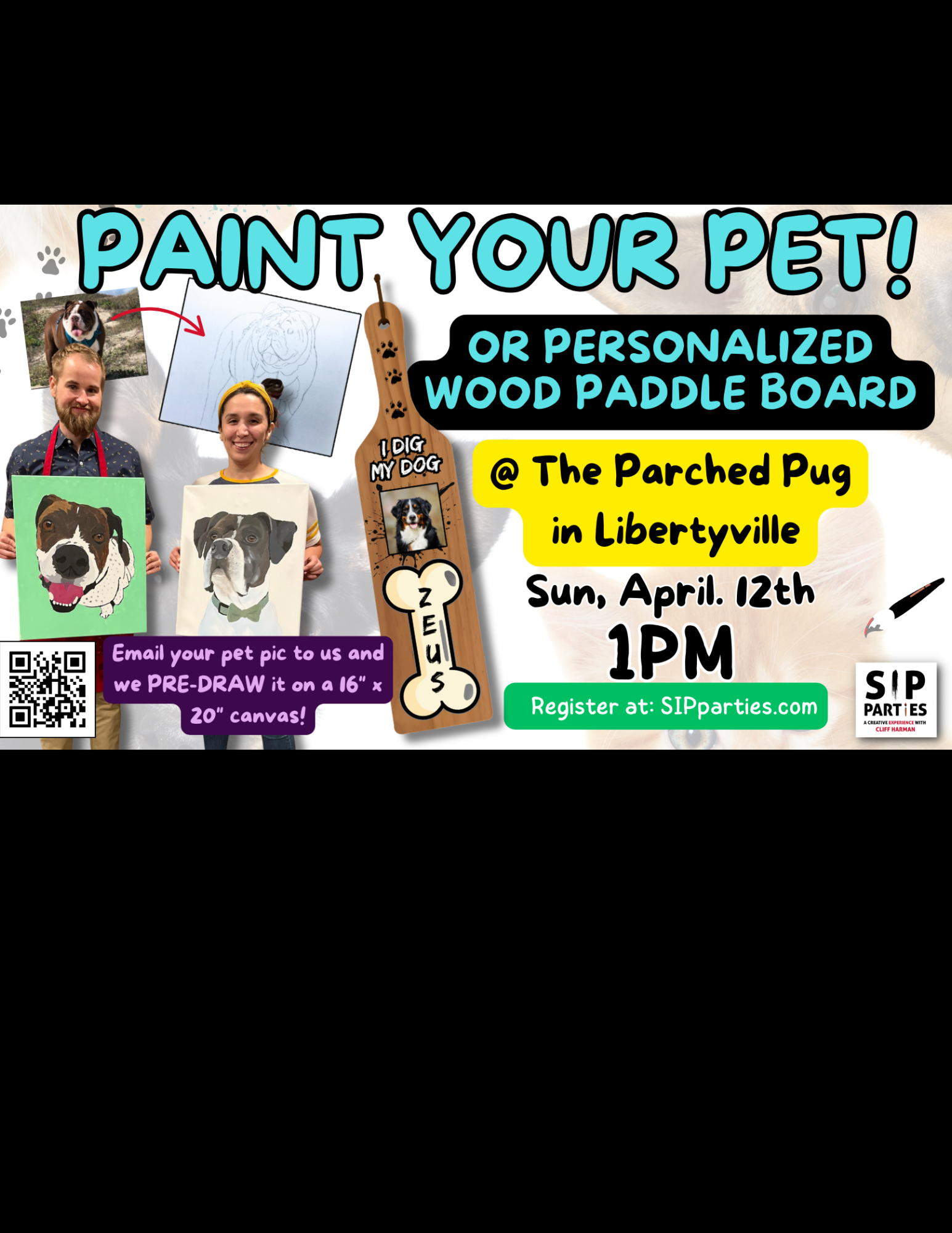 Join us at The Parched Pug in Libertyville to paint your pet! SIP Parties is a unique twist on your typical SIP & Paint party experience! Enjoy a lively performance that brings humor and audience interaction to detailed art instruction.  Whether you’re looking to do a girl’s night out or enjoy a date night with the hubby, we are the perfect local activity.