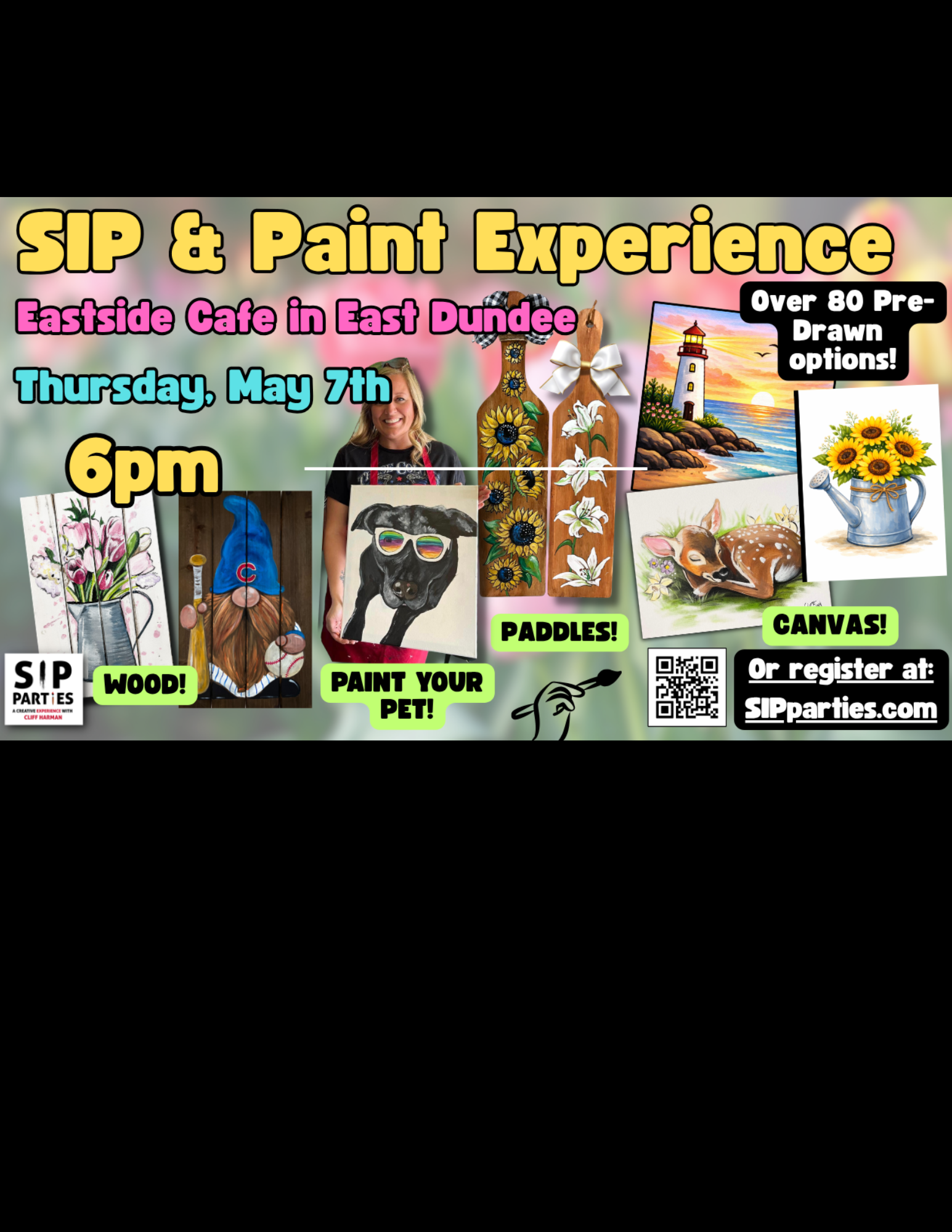 Join Cliff with Chicagoland’s #1 rated creative experience as we visit East Side Cafe in East Dundee with some fun new PRE-DRAWN designs and personalized pet painting options! SIP Parties is a unique twist on your typical SIP & Paint party experience! Enjoy a lively performance that brings humor and audience interaction to detailed art instruction with artist Cliff Harman.  Whether you’re looking to do a girl’s night out or enjoy a date night with the hubby, we are the perfect local activity. Find us at a bar or restaurant in your neighborhood!