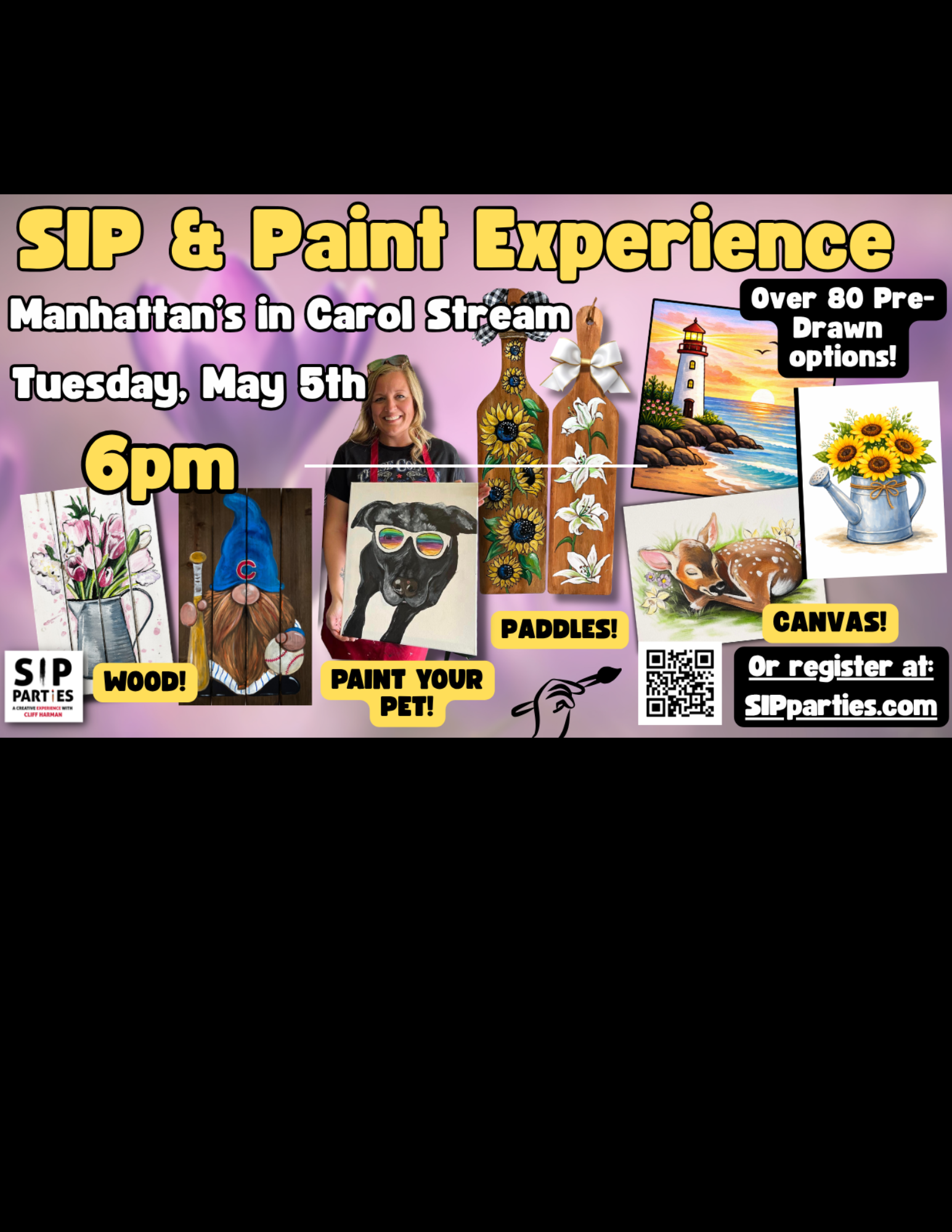 Join Cliff with Chicagoland’s #1 rated creative experience as we make our return to Manhattan’s American Bar & Grill in Carol Stream with some fun new PRE-DRAWN designs and personalized pet painting options! SIP Parties is a unique twist on your typical SIP & Paint party experience! Enjoy a lively performance that brings humor and audience interaction to detailed art instruction with artist Cliff Harman.  Whether you’re looking to do a girl’s night out or enjoy a date night with the hubby, we are the perfect local activity. Find us at a bar or restaurant in your neighborhood!