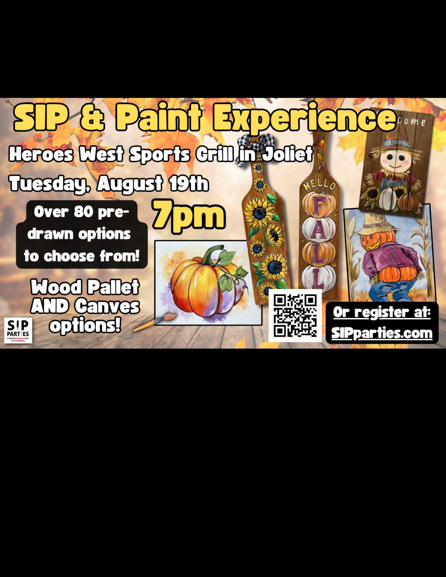 Join Chicagoland’s #1 rated creative experience as we return to Heroes West Sports Grill in Joliet with some fun new designs! SIP Parties is a unique twist on your typical SIP & Paint party experience! Enjoy a lively performance that brings humor and audience interaction to detailed art instruction with artist Cliff Harman.  Whether you’re looking to do a girl’s night out or enjoy a date night with the hubby, we are the perfect local activity. Find us at a bar or restaurant in your neighborhood!