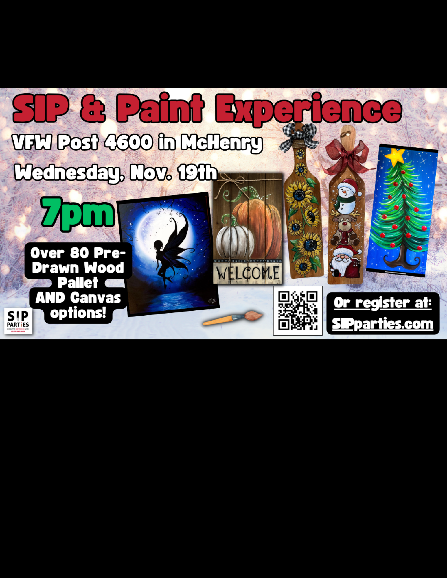 Join Chicagoland’s #1 rated creative experience on Wednesday, November 19th at VFW Post 4600 in McHenry! SIP Parties is a unique twist on your typical SIP & Paint party experience! Enjoy a lively performance that brings humor and audience interaction to detailed art instruction with artist Cliff Harman.  Whether you’re looking to do a girl’s night out or enjoy a date night with the hubby, we are the perfect local activity. Find us at a bar or restaurant in your neighborhood!