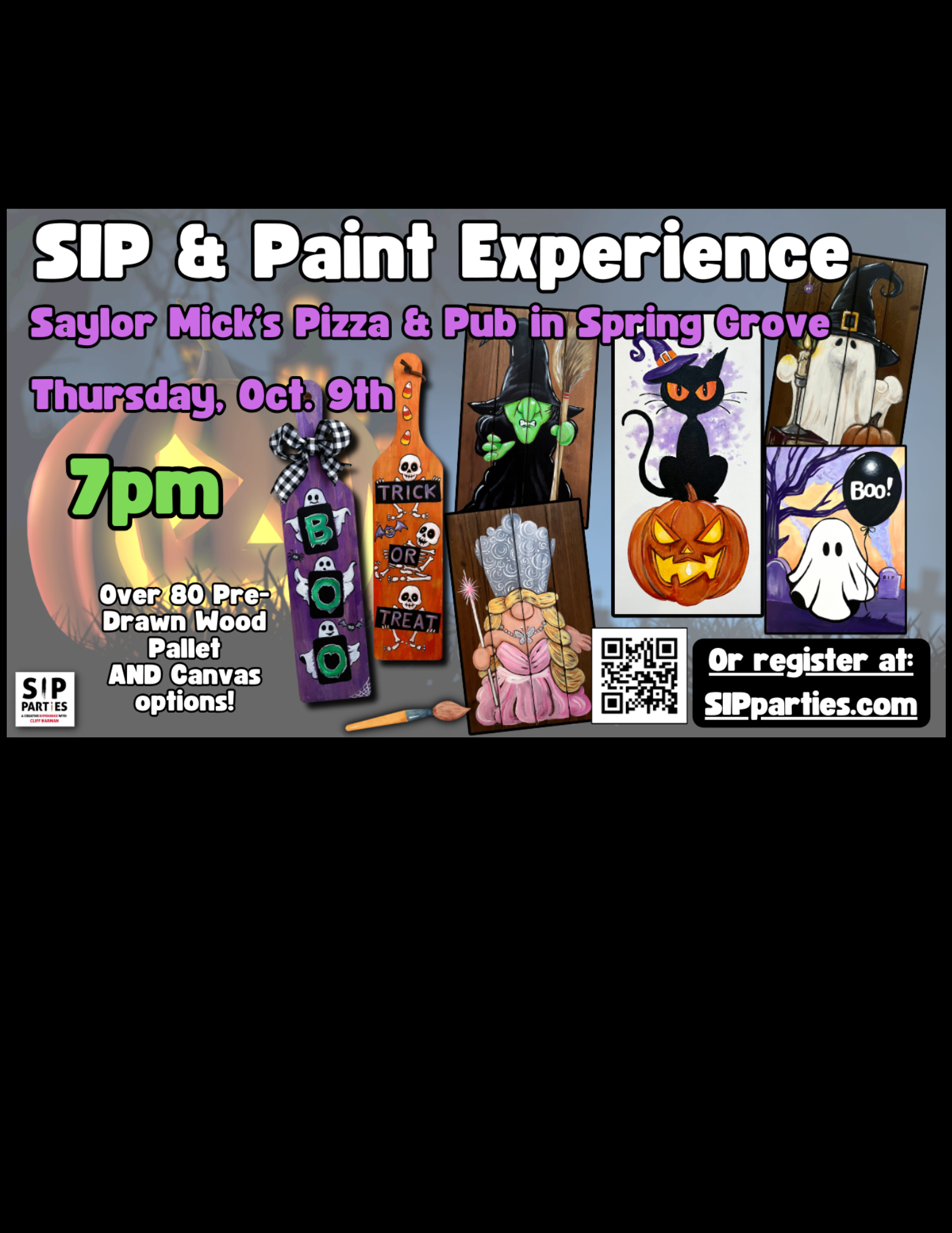 Join Chicagoland’s #1 rated creative experience on Thursday, October 9th at Saylor Mick’s Pizza & Pub in Spring Grove! SIP Parties is a unique twist on your typical SIP & Paint party experience! Enjoy a lively performance that brings humor and audience interaction to detailed art instruction with artist Cliff Harman.  Whether you’re looking to do a girl’s night out or enjoy a date night with the hubby, we are the perfect local activity. Find us at a bar or restaurant in your neighborhood!