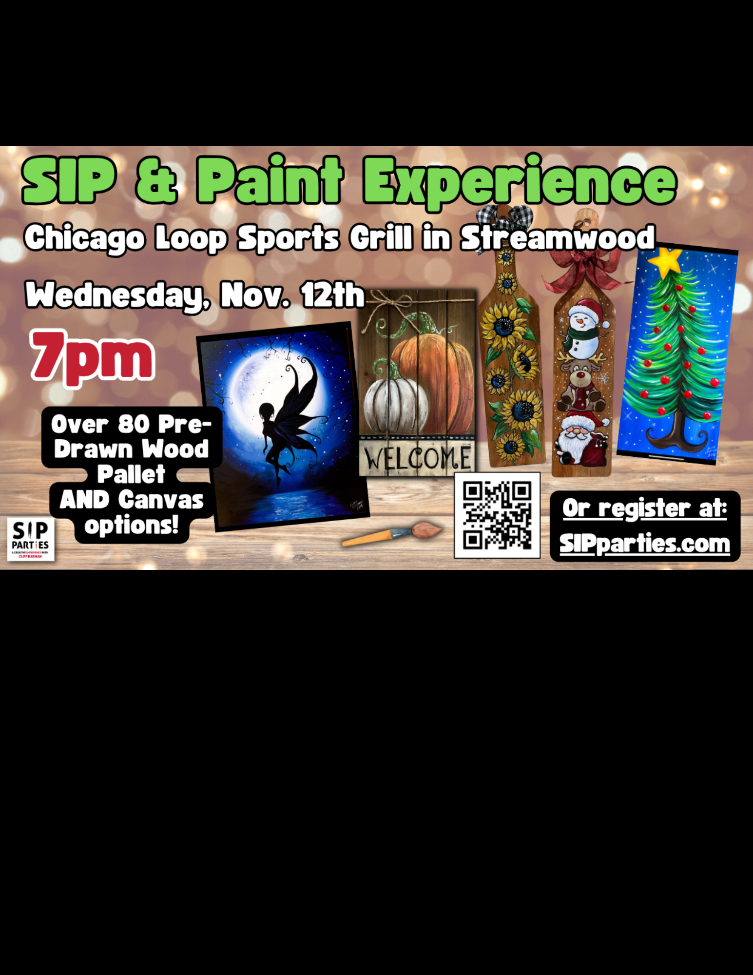 Join Chicagoland’s #1 rated creative experience on Wednesday, November 12th as we return to the Chicago Loop Sports Bar & Grill in Streamwood! SIP Parties is a unique twist on your typical SIP & Paint party experience! Enjoy a lively performance that brings humor and audience interaction to detailed art instruction with artist Cliff Harman.  Whether you’re looking to do a girl’s night out or enjoy a date night with the hubby, we are the perfect local activity. Find us at a bar or restaurant in your neighborhood!