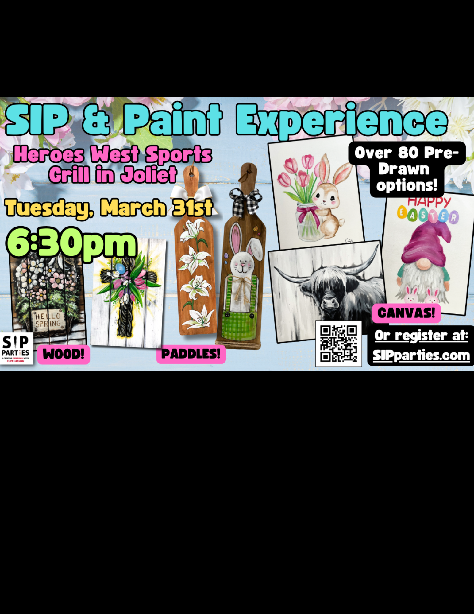Pre-Drawn SIP & Paint Experience! Heroes West Sports Grill in Joliet. Tues, March. 31st 6:30PM