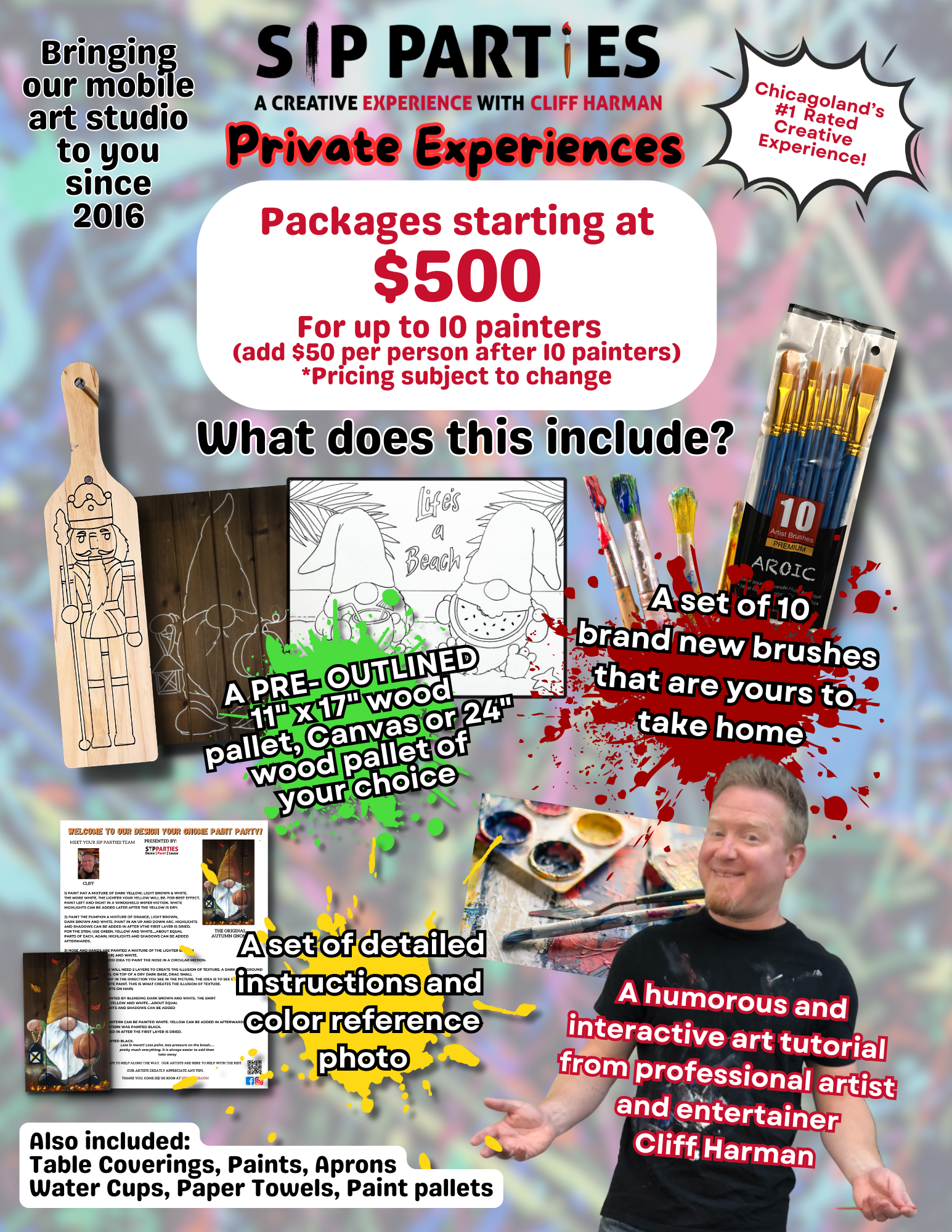 Sit back while we take care of the entertaining during your private on-site painting event. You provide the space and we offer detailed painting instruction from an acclaimed artist in a “showmanship” style performance with lively humor and audience interaction. This is truly an experience that your guests will remember!
